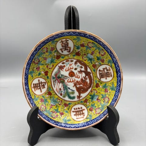 Kinesisk porcelæn famille rose med låg fra Republikkens periode (1912–1949), dekoreret med en drage og en fennek som jager en flammande perle blandt skyerne, turkis meanderkant, Qianlong-mærke, Ø 25 cm; generelt i god stand med en lille hårlinie ved kanten. Klik på den blå "gå til varen" knap, for at købe eller byde på denne vare. Den samlede pris vil blive vist inden du afgiver dit bud.