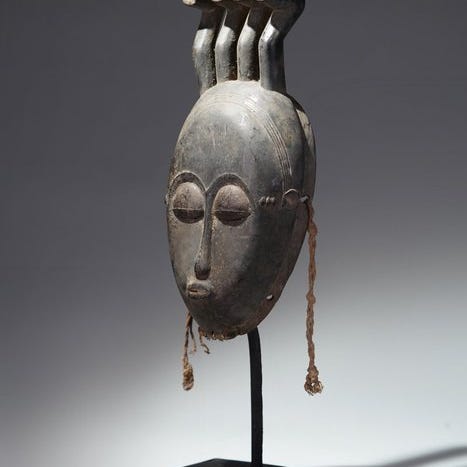 En hornet Baule-maske, Elfenbenskysten, Sikassou-regionen, fra Essankro-udskærerens værksted, en af de mest fremragende masker, vi har samlet i denne region i løbet af de seneste tre årtier, denne maske, med sit omhyggeligt modellerede ansigt toppet af buede og rillete horn, inkl. metalsstand,
