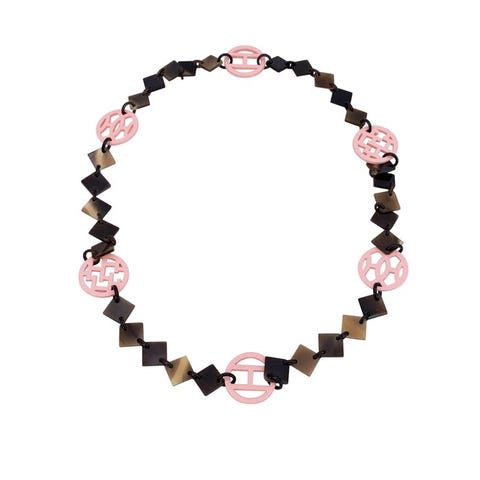 Denne Hermès Fidelio-halskæde indkarmer husets forfine tilgang til moderne design og naturlige materialer. Fidelio-modellen er kendetegnet ved et skulpturalt ovalvedhæng fremstillet af mørkt horn, der viser subtile organiske variationer, så hvert stykke er unikt. I midten skaber en kontrasterende hvidlakeret udskæring et grafisk markant detalje, der giver halskæden et moderne, men tidløst æstetisk udtryk. Vedhænget hænger i et brunt snorehalsbånd, som giver behagelig og justerbar bæring. Tro mod Hermès’ designfilosofi afbalancerer Fidelio enkelhed med karakter og kombinerer ædle materialer og rene linjer i et