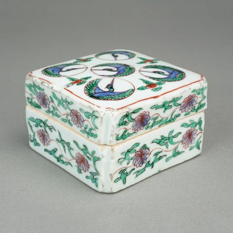 Smuk æske til afghanske krydderier fra midten af det tyvende århundrede. 6 rum, med glidende låg. Originale farver,