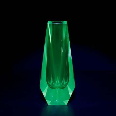 De små mængder uran i glasset får denne figur til at lyse i et strålende grønt lys under UV-lys ved 365 nm.