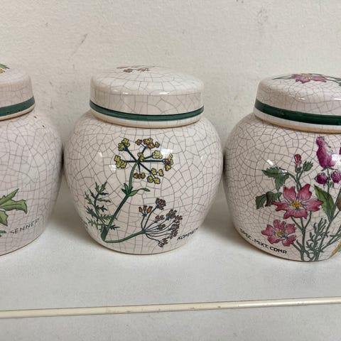 Fajance, Gamle krydderikrukker, Marie, De 5 krukker er 9 cm høje med en åbning på 5,5 cm x 5,5 cm.