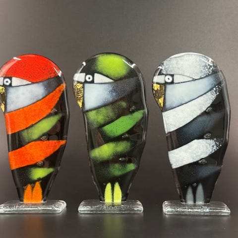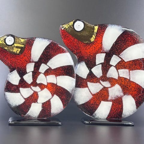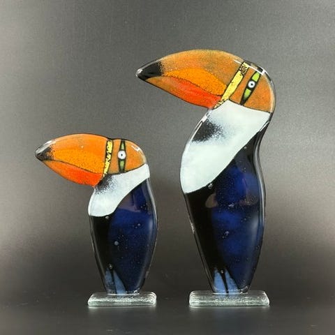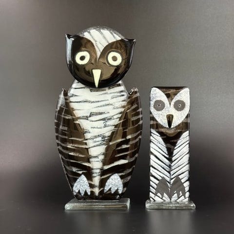 Et flok af håndlavede, karakterfulde mejser fremstillet i en smelteteknik af Maciej Habrat, en polsk kunstner, der har arbejdet med glas i over 20 år. Opal- og klart glas smeltes sammen for at skabe disse spontane skabelser fyldt med farver og uhæmmet fantasi. De vil se fantastiske ud på en vindueskarm eller en pejsesims og vil fremhæve dit kontor.