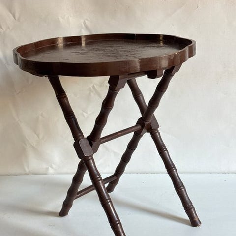 Rund trekantede bordet træbord i polykromt træ, Art Nouveau-stil, fremstillet i Italien; 40 cm bredt, 40 cm dybt, 50 cm højt, vejer 5 kg, fra perioden 1970–1980, i god brugt stand med mindre alders- og imperfektionsmærker, top med polykrom dekor af en fugl og stiliseret vegetation. Klik på den blå "gå til varen" knap, for at købe eller byde på denne vare. Den samlede pris vil blive vist inden du afgiver dit bud.