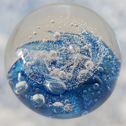 Organisk dråbeform med ujævn overflade. Klart farveløst krystalglas med en spektakulær dobbelthelix af glasfibre i blå og grønne nuancer, hvor mange forskellige størrelser gyldne perler er trukket på. Helixen svæver over en blå- og hvidmarmoreret bund. Fortryllende farvespil og smukke optiske effekter - særligt under passende belysning. Sjældent og meget dekorativt