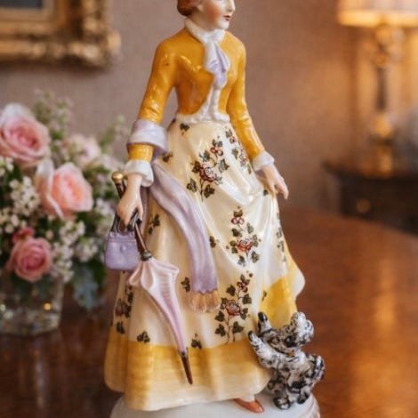 Allegorisk porcelænsfigur – Kvindelig figur med gylden kugle – Tyskland – ca. 1930–1950