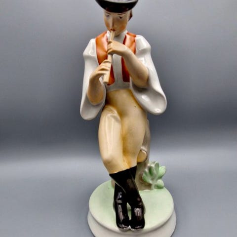 Porcelæn allegorisk figur: Die Kugelspielerin, der fremstiller en kvindelig figur med en gylden kugle, Tyskland, sen Art Deco-stil, ca. 1930–1940, mål ca. 20 × 13 × 8 cm, vægt 350 g, i fremragende stand med minimale brugsspor. Klik på den blå "gå til varen" knap, for at købe eller byde på denne vare. Den samlede pris vil blive vist inden du afgiver dit bud.
