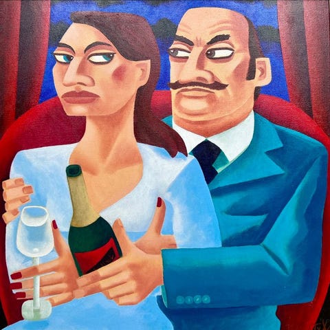 Et dristigt, ekspressionistisk værk af Simion Muntean kendetegnet ved tyk, energisk penselstrøg og en mørk, efterårsagtig palet. Maleriets lagdelte impasto og kraftige paletknivsaftryk skaber en skulpturel overflade, der antyder figurer samlet i et tæt rådslagning. Kompositionen balancerer tætte sorte masser med varme okker og røde farver og skaber en dramatisk, intim stemning.