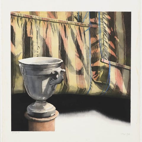 Dette værk af Max Kreyn viser et gardin, der hviler på en lav vindueskarm. Det er næsten abstrakt på grund af de former, der udgør helheden.