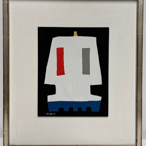 Werner Graeff, Ohne Titel, 1973, akrylmaling på finertræ med læderimitation passepartout, indrammet 42 × 37 cm (maleri 24 × 19 cm), signeret og dateret; originaludgave; periode 1970–1980; tysk oprindelse; abstrakt stil; solgt med ramme. Klik på den blå "gå til varen" knap, for at købe eller byde på denne vare. Den samlede pris vil blive vist inden du afgiver dit bud.