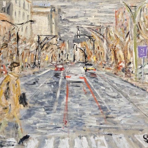 De orangevogne står i kontrast til loftets hvidlige lys, symbol på metropolens puls. De menneskelige skikkelser, kun