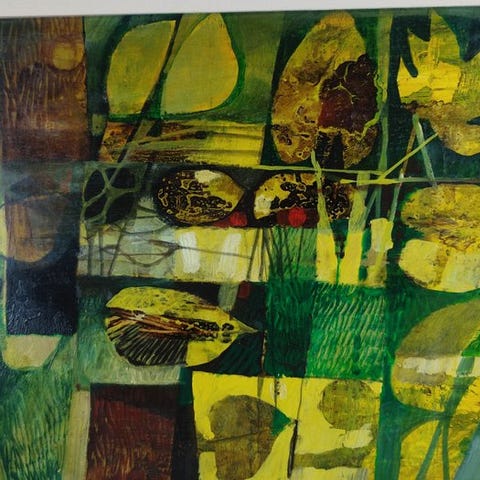 Dette maleri er et levende og fantasifuldt værk, der blander en naïv stil med eventyrlige elementer.