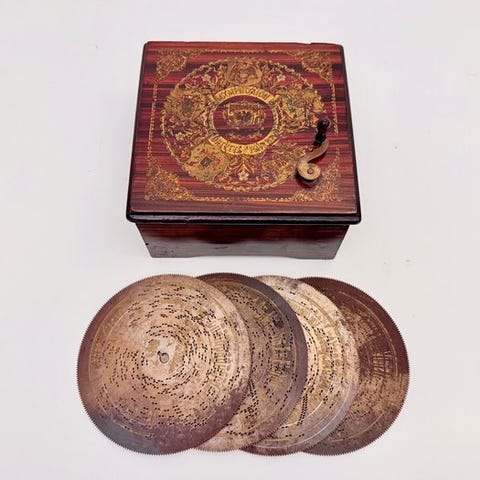 Antik Musikwerke Leipzig Musik-Polyphon i trææske, Tyskland, cirka 1910–1920, 24 cm høj og 27 cm bred, med 14 metalperforerede skiver, testet og i funktion med tænde/slukke-udstyr, inklusive bue. Klik på den blå "gå til varen" knap, for at købe eller byde på denne vare. Den samlede pris vil blive vist inden du afgiver dit bud.