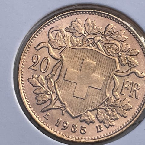 Denne elegante guldmønt stammer fra Schweiz' Forbundsstat-periode (1848–nutid), og udgaven fra 1922 er et stolt medlem af Vreneli-serien. Mønten er præget i guld (0,900 finhed / 90% guld, 10% kobber). Denne mønt er et smukt eksempel på schweizisk numismatisk kunst, der kombinerer elegance, historie og indhold af ædelt metal. Hver enkelt mønt kan vise subtile forskelle i slid og patina—egenskaber, der giver hver mønt sin egen
