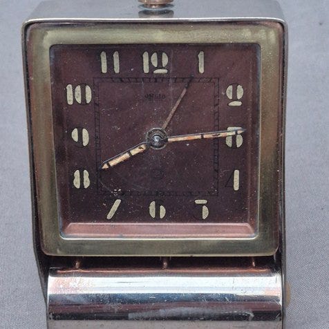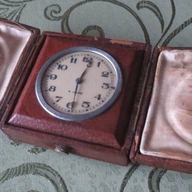 Jaeger-LeCoultre Cricket Ref. 141 Travel Alarm bærbar mekanisk vækkeur fra 1960–1970 i bronze/metal med 8-dages gang, schweizisk, i god brugt stand og i funktion, med nøgle og læderetui (skadet). Klik på den blå "gå til varen" knap, for at købe eller byde på denne vare. Den samlede pris vil blive vist inden du afgiver dit bud.
