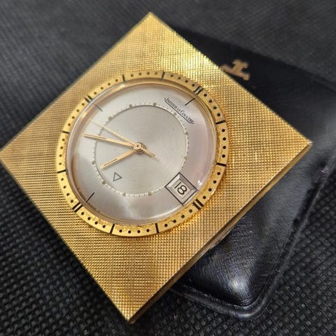 JLC ref. 141 Travel Alarm Clock: 1950'ernes bærbare mesterværk. Indeholder to fulde mekaniske værker (tid og alarm). Kendt for sin usædvanligt høje, græshoppe-lignende alarm — et karakteristisk træk, der senere inspirerede til kælenavnet "Cricket" blandt samlerne. Anbragt i sit ikoniske læderetui (beskadiget), følger med et informationsblad og en æske. En højdepunkt inden for miniaturiseret, praktisk komplikation fra Manufacture.