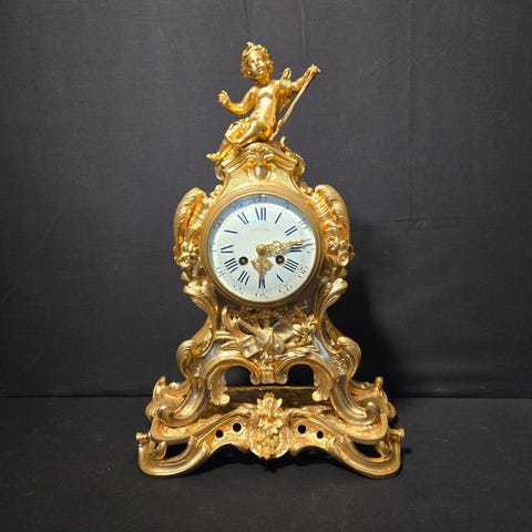 Blikket fanges straks af dens arkitektur-agtige silhuet, hvor den runde urkasse ligger på en konsolbærende stander, og især af de to duer med yndefulde modellerede vinger, som ser ud til at være overrasket i fuld bevægelse. Dette 'galante'-motiv, symbol på forening og ømhed, tilfører hele værket en sjælden poesi. Det er en intimes, raffineret genstand.