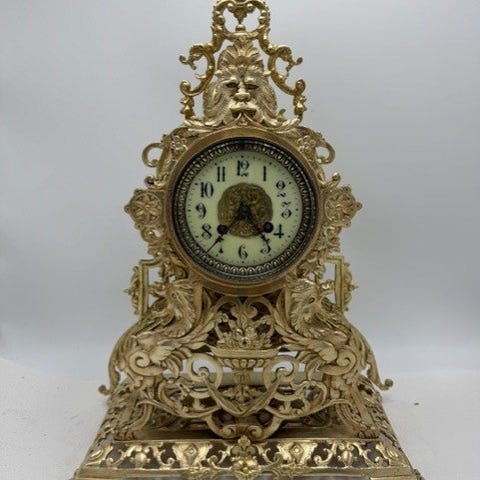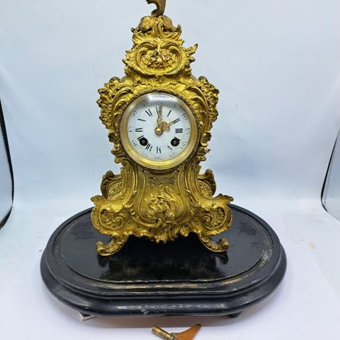 Bronze Rococo pendelo klok fra Frankrig, ca. 1850–1900, mekanisk urværk, 8-dages gangreserve, halvtimes slag med en klokke, højde 55 cm, bredde 36,5 cm, dybde 19 cm, vægt 8 kg, opdrift Nøgle medfølger, i god brugt stand og i funktion. Klik på den blå "gå til varen" knap, for at købe eller byde på denne vare. Den samlede pris vil blive vist inden du afgiver dit bud.