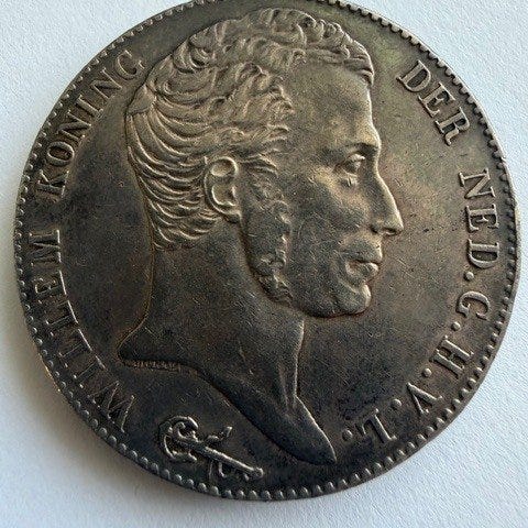 Kongeriget Nederlandene 1 Gulden fra 1819, sølv, 10,7 g, præget under Kong Willem I, ikke certifikat, UNC med original glans og attraktiv patina på bagsiden. Klik på den blå "gå til varen" knap, for at købe eller byde på denne vare. Den samlede pris vil blive vist inden du afgiver dit bud.