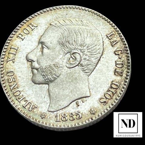 5 pesetas mønt af Alfonso XIII, præget i Madrid i 1896, vægt 25,00 g sølv, stand uden certifikat. Klik på den blå "gå til varen" knap, for at købe eller byde på denne vare. Den samlede pris vil blive vist inden du afgiver dit bud.
