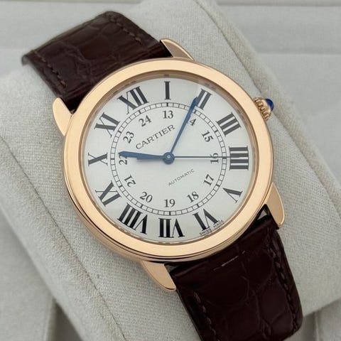 Til tilbud er en Cartier Ronde de Croisière, reference 3886, med en markant 42 mm rustfri stålkasse, sort urskive og det originale Cartier stålkæde.