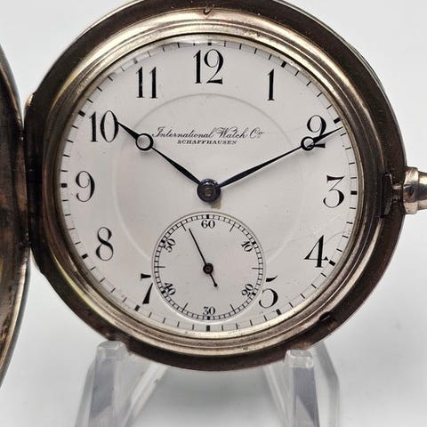 En tidlig IWC (International Watch Co.) mekanisk lommeur med hvid urskive, der har en 12/24-timers dobbelt skala, lille sekundviser kl. 6, og urskiven underskrevet O. Johansson, Uppsala. Sølvkasse med indvendig låg; den indvendige lågs udsender INTERNATIONAL WATCH CO. dekorativ tekst. Generelt viser uret normalt brug og alderspatina; fungerer normalt.