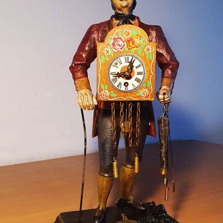 Jernbordur med polykrom figur af urforhandler, estimeret periode 1950–1960, mekanisk urværk, lang gangreserve, støjer ikke slag, oprindelse Tyskland, i god brugt stand, 41 cm høj, 16 cm bred, 16 cm dyb, vægt 3 g, med optræknøgle, bordur til sælger. Klik på den blå "gå til varen" knap, for at købe eller byde på denne vare. Den samlede pris vil blive vist inden du afgiver dit bud.