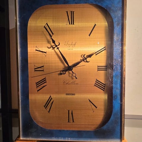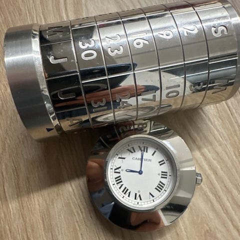 Som vedlagte fotografier, bordklokke der skal restaureres med manglende opladningsnøgle. Cartier-model fra 80'erne i forgyldt lakkeret messing, glas i fremragende stand, flere tegn på slid.