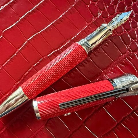 - 18K guld, rhodium-belagt, tosfarvet nib indgraveret med «M».