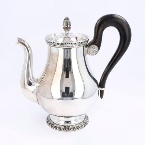 Elegant Christofle Malmaison te- og kaffebaresæt i sølvplet, Empire-stil, fremstillet i Frankrig (anden halvdel af 1900-tallet, ca. 1960–1980). Klassiske linjer med buede kroppe, kløf pff0, bladdekor og dyrehoved-formede snuder; håndtag i mørkt træ, der skaber en raffineret kontrast til metallisk sølvglans. Perfekt til et formelt bord eller som scenografisk element i stuen, loungen/bar eller boutique-hoteller.