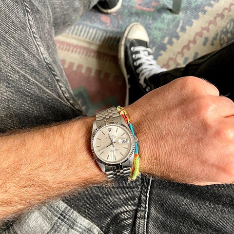 Denne klassiske Datejust har en klassisk sølvskive, en krans i hvidguld og den koordinerede Jubilee-lænke.