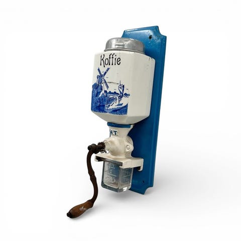 Vægkaffekværn i glasurbelagt keramik med mekanisme og håndsving i metal. Blå inskription « CAFE » i traditionel stil.