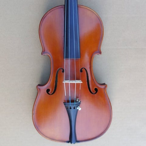 Til salg er en gammel, fin fuldstørrelse mesterviolin, fremstillet og mærket: "Frank Reiner Hamburgensis me fecit nobile cantabile amabileque sonantem Anno 1924 13899". Mageren har allerede beskrevet lyden – det er korrekt: han gjorde mig ædel, melodisk og charmerende, hvilket vækker beundring. Instrumentet er klar til spil med et godt ibenholt-setup, gammelt mesterbro af Etienne Vatelot (Paris) og nye strenge. Små professionelt reparerede revner i toppladen. Klangen er kraftfuld, sød, rig, klar som en klokke og fokuseret med mange farver at arbejde med. Det reagerer og er jævn i alle registre. Violinen har en to-delt bagside lavet af smukt flammet ahorn med matchede sider og scroll; toppladen er ligeledes af høj kvalitet, højvandet gran. Purflingen er omhyggeligt inlagt foran og bagpå. Original gyldenbrun lak over en lysere grundfarve."
