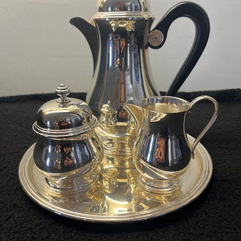 Til salg står en elegant porcelænskande med tre matchende tallerkener fra huset Schirnding. Servicen fremstår i klassisk hvid med fin guldrand og tidsløs formgivning.