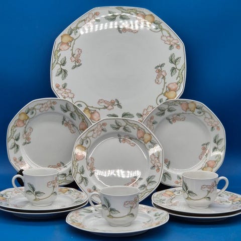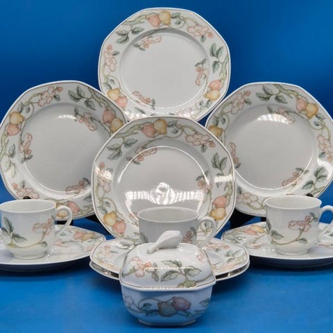Til salg er et farverigt kaffestel fra Villeroy & Boch med dekorationen "Summer Day". Det højkvalitets vitreous porcelæn har et levende blomstermotiv i varme nuancer af rød, gul og grøn kombineret med en dekorativ, geometrisk kant. Det harmoniske design giver stellet et klassisk, men friskt udseende.