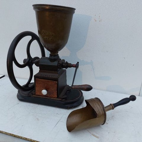 Et originalt kaffekværn fra slutningen af 1800-tallet / begyndelsen af 1900-tallet, fremstillet af Peugeot Frères (Frankrig).