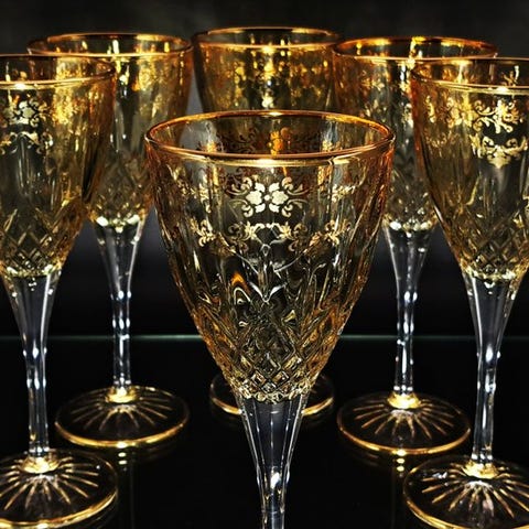 Artemisia: 6 champagne- og mousseringsglas i højkvalitets krystal, dekoreret med blonder-effekt, i 24 kt. guld i farven fume.