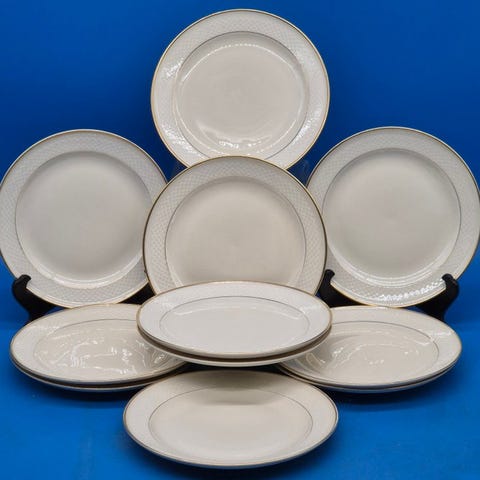 Til salg står tolv elegante spise-tallerkener fra huset C.T. Tielsch-Altwasser, dekor 'Ingeborg'. Tallerkenerne tiltrækker med deres klassiske formgivning, diskret svungen reliefdekoration og fin guldstaffering ved kanten.
