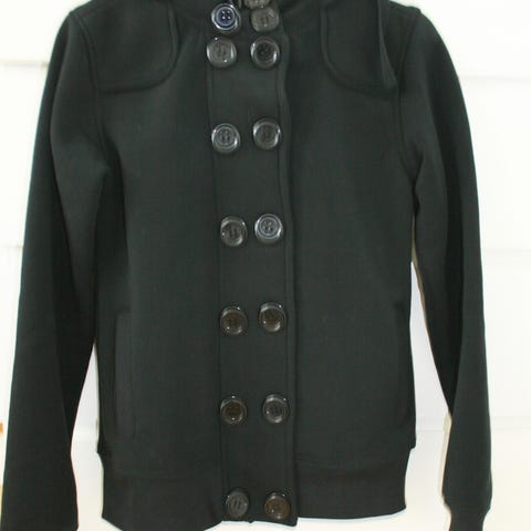 Design: Dobbelt række knapper foran og praktisk, aftagelig hætte