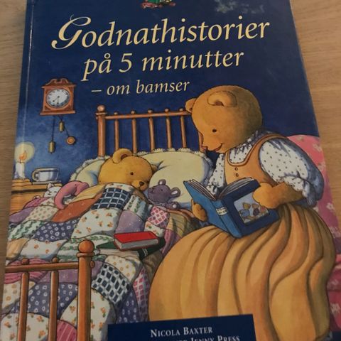 "Godnathistorier på 5 minutter – om bamser" billedbog med korte godnathistorier om en bamsefamilie og deres hverdag. Bogen indeholder flere illustrerede historier med farverige tegninger på hver side. Teksten er sat op i letlæselige afsnit, velegnet til højtlæsning for børn ved sengetid. Historierne spænder over forskellige hverdagssituationer og små oplevelser, som børn kan genkende. Bogen er indbundet (hardback) og trykt på kraftigt papir med tryk i farver på alle sider.