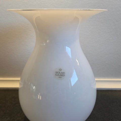 Holmegaard vase i hvidt glas. Vasen har rund fod og høj, trompetformet krop med let udadbøjet kant. Egnet til afskårne blomster eller som dekorativt element i indretningen. Klassisk design i gennemfarvet glas.