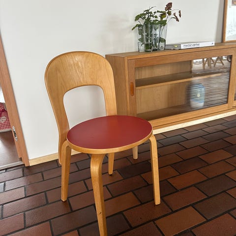 Artek stol designet af Alvar Aalto. Stolen er udført i formspændt birkefiner med buede ben og ryg. Sædet er rundt med hvid overflade, mens stel og ryg er i naturfarvet birk. Velegnet som spisebordsstol, ekstra stol i stuen eller til kontor og køkken. Har en lille rids i træet, se billede, ellers i stort set perfekt stand. Kan afhentes på Vesterbro i København