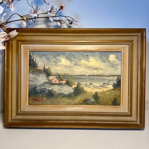 Billede med landskabsmaleri af kystmotiv med klinter og hav.