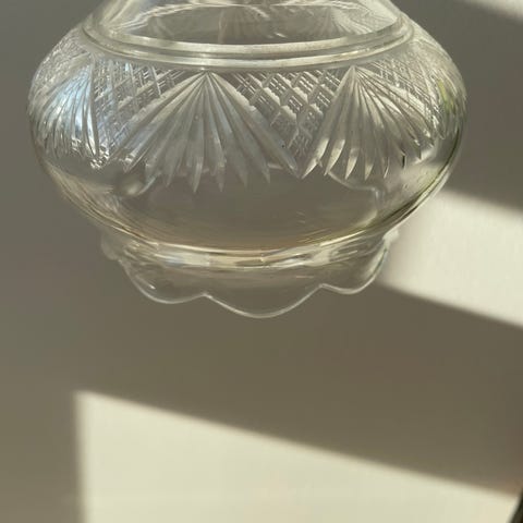 Smuk, gammel lampe, pendel, i glas med fin tungekant. Ca. 13 cm i diameter. Købt i antikvitetshandel. Pæn stand. Sendes ikke (kan afhentes på Islands Brygge).