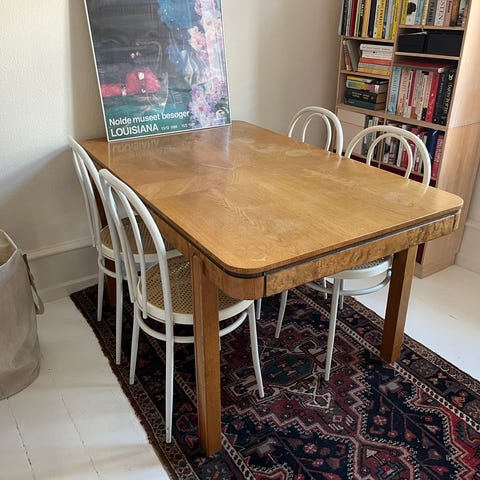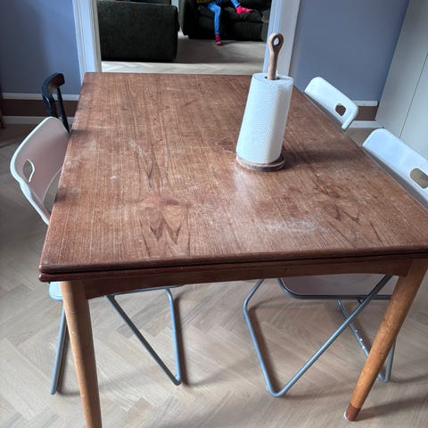 Med udtræksplader – nemt at forlænge, når der kommer gæster. Bordet har almindelige brugsspor, kan slibes og det vil stå helt skarpt igen.