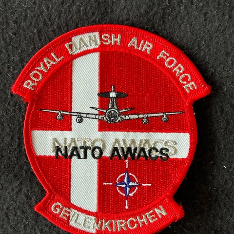 Samling af Danish Air Force stofmærker. Mærkerne er runde og broderede med forskellige motiver og tekster relateret til det danske flyvevåben, herunder instruktør- og eskadrillemærker.