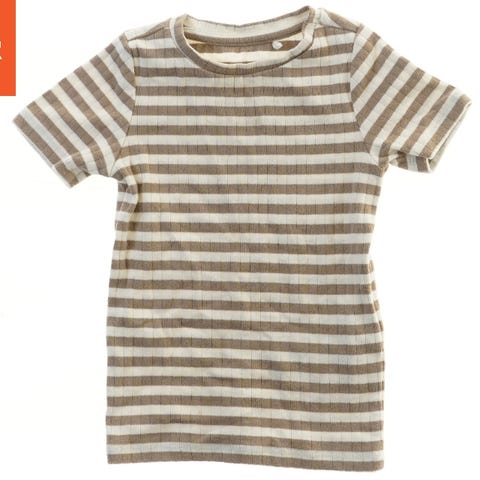 Sæt bestående af en gul og hvidstribet t-shirt og gule shorts. T-shirten har korte ærmer med et enkelt tryk på fronten. Shortsene har en elastisk talje med hvidt snøre og en lille udsmykning nederst.