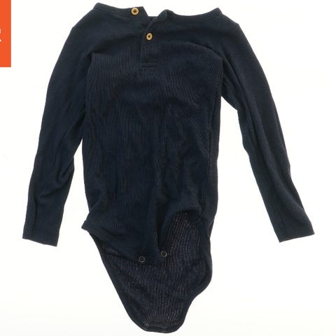 Langærmet bodystocking i blå farve. Den har knapper ved halsen og trykknapper ved bunden for nem på- og afklædning.