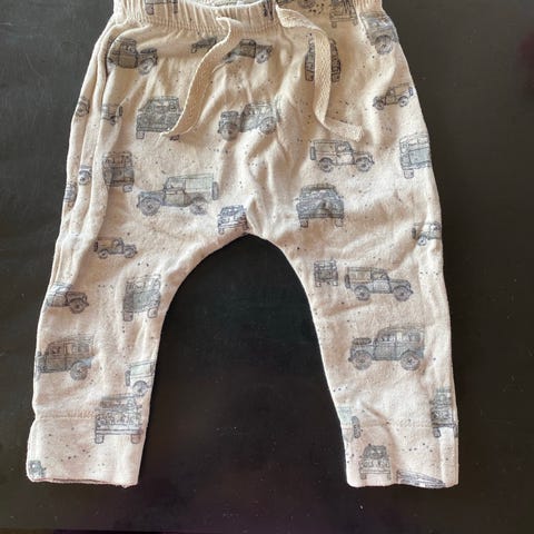 Babybukser med elastik og snørebånd i taljen. Bukserne er dekoreret med et mønster af forskellige små motiver, herunder blomster og andre elementer. Stoffet ser ud til at være blødt og behageligt.