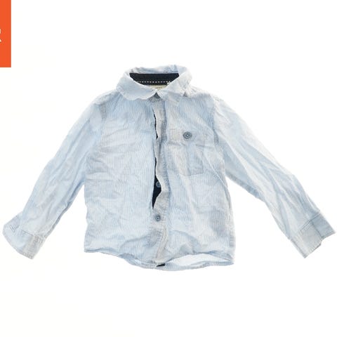 Lyseblå langærmet skjorte med krave og knaplukning foran. Skjorten har knapper på manchetterne og et lille logo broderet på forsiden. Materialet ser let krøllet ud, hvilket giver et afslappet udtryk.